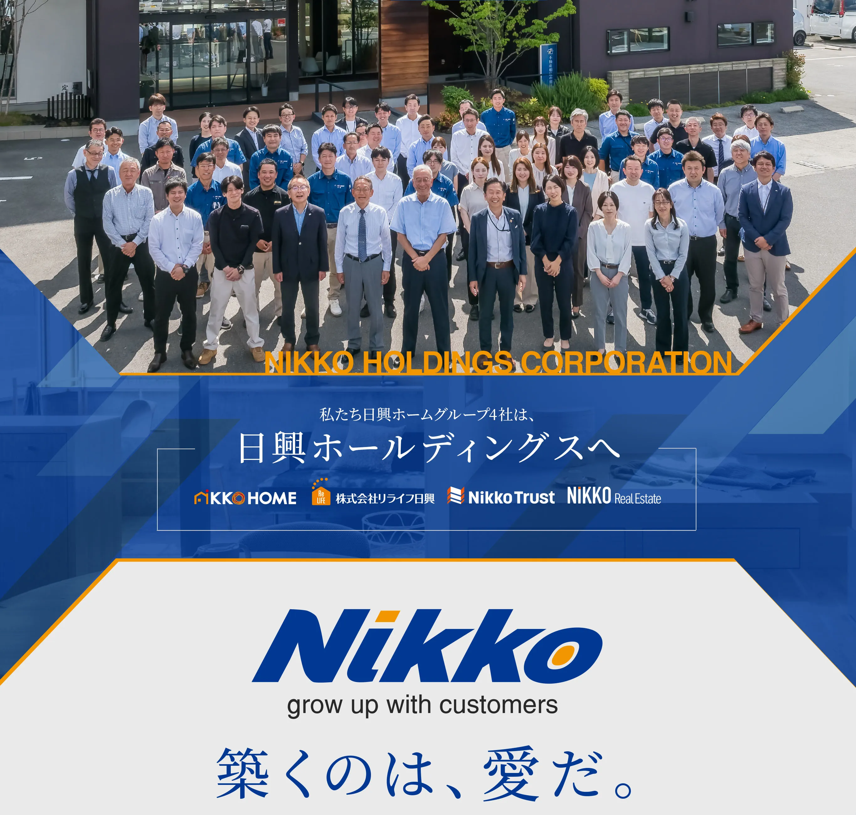 私たちの取り巻く社会環境は、急速な少子高齢化・人口減少による人手不足や、働き方・住まい方の多様な選択、また、将来への「貯蓄から投資」への意識の変化など、今までになく急激に変わりつつあります。私たちは、この環境の変化のスピードに、いち早く対応するために、各事業の役割を明確にし、お客様によりご満足を頂くことを目的とし、日興ホールディングスとして、注文住宅部門・不動産賃貸部門・土地資産活用部門・リフォーム部門の4社に分社化し、新たなスタートをする事といたしました。日興ホームグループ4社は、いち早くお客様のニーズ・社会環境に応え、課題解決を行い、多彩な住宅・不動産・資産運用・リフォーム・リノベーションなどの分野に於いて、質の高いサービスを提供し、豊かな暮らしを総合的に提案できる企業として、お客様と共に成長し続けていきたいと考えております。何卒、これまでと変わらぬ、ご支援ご指導を賜りますようお願い申し上げます。